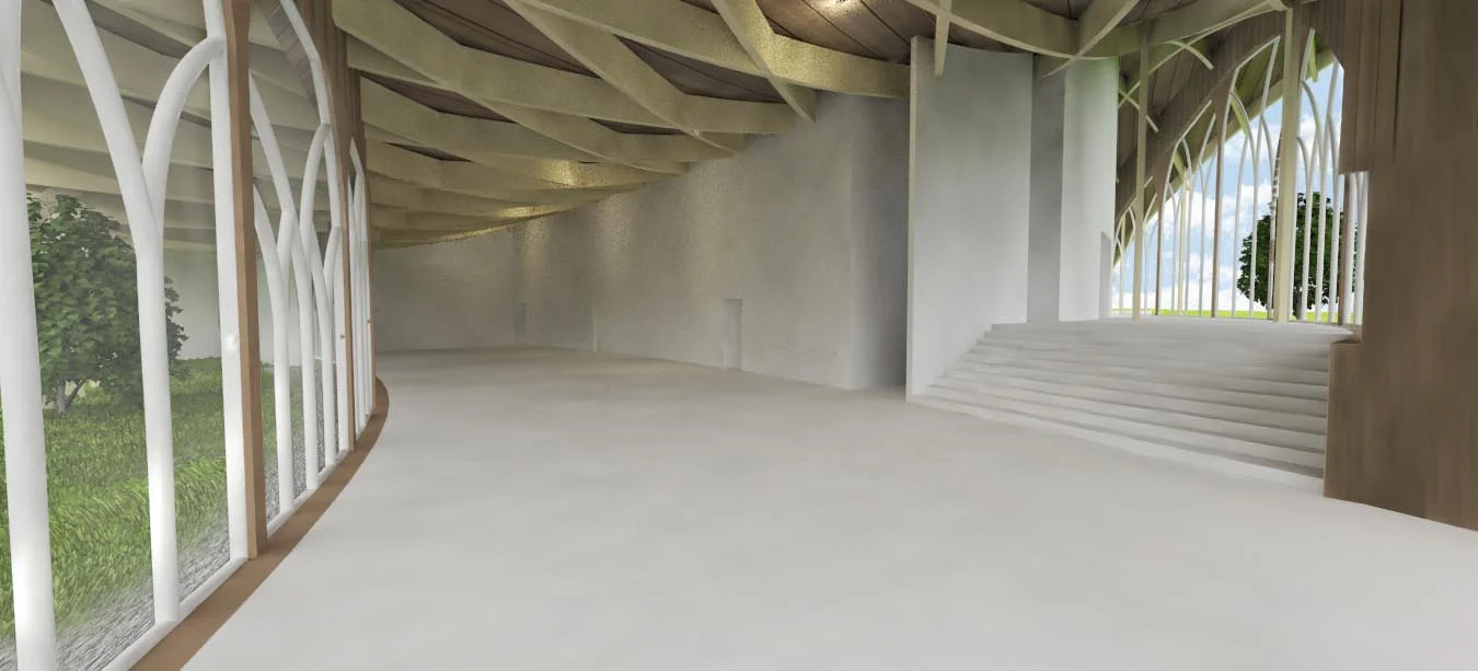 The facade of the building has a high level of glazing, to augment the feeling of being in a pavilion. The sweeping, woven roof extends out past the building as an open structural weave, creating a sense of enclosure for the front-of-house bosque. The performance chamber continues this flowy, delicate language. The woven structure is visible overhead, with delicate catwalks interwoven into the columns. Even inside, the chamber continues the experience of the theater in a garden.
