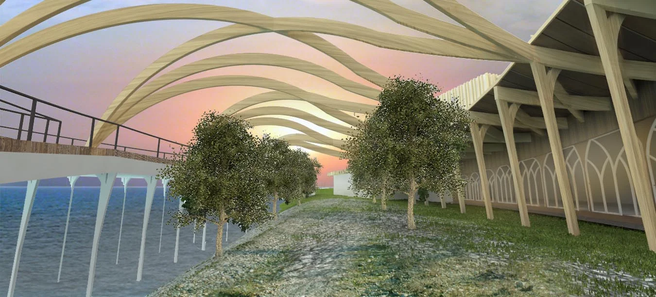 Pedestrian access is along the garden path designed for the southern shore, bringing pedestrians past the Festival venues, and through the bosque of the primary venue. Vehicle access is from the north, swinging around to connect to the building on the northern side, so as not to disturb the garden. However, the garden path is handicap accessible along its length.